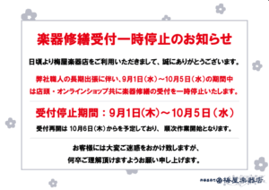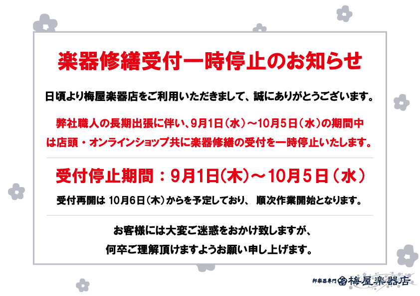 弊社職人の長期出張に伴い、9/1~10/6の期間中は店頭・オンラインショップ共に楽器修繕の受付を一時停止いたします。